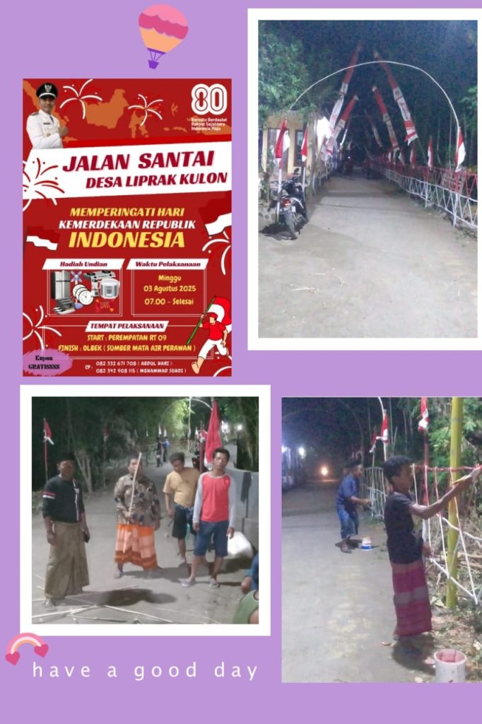 Dengan persiapan yang matang dan partisipasi aktif dari warga, Desa Liprak Kulon siap meriahkan Hari Kemerdekaan ke-80 RI dengan kegiatan yang meriah dan menyenangkan. Semoga kegiatan ini dapat meningkatkan kesadaran dan cinta tanah air di kalangan warga Desa Liprak Kulon dan desa-desa lain di Indonesia.