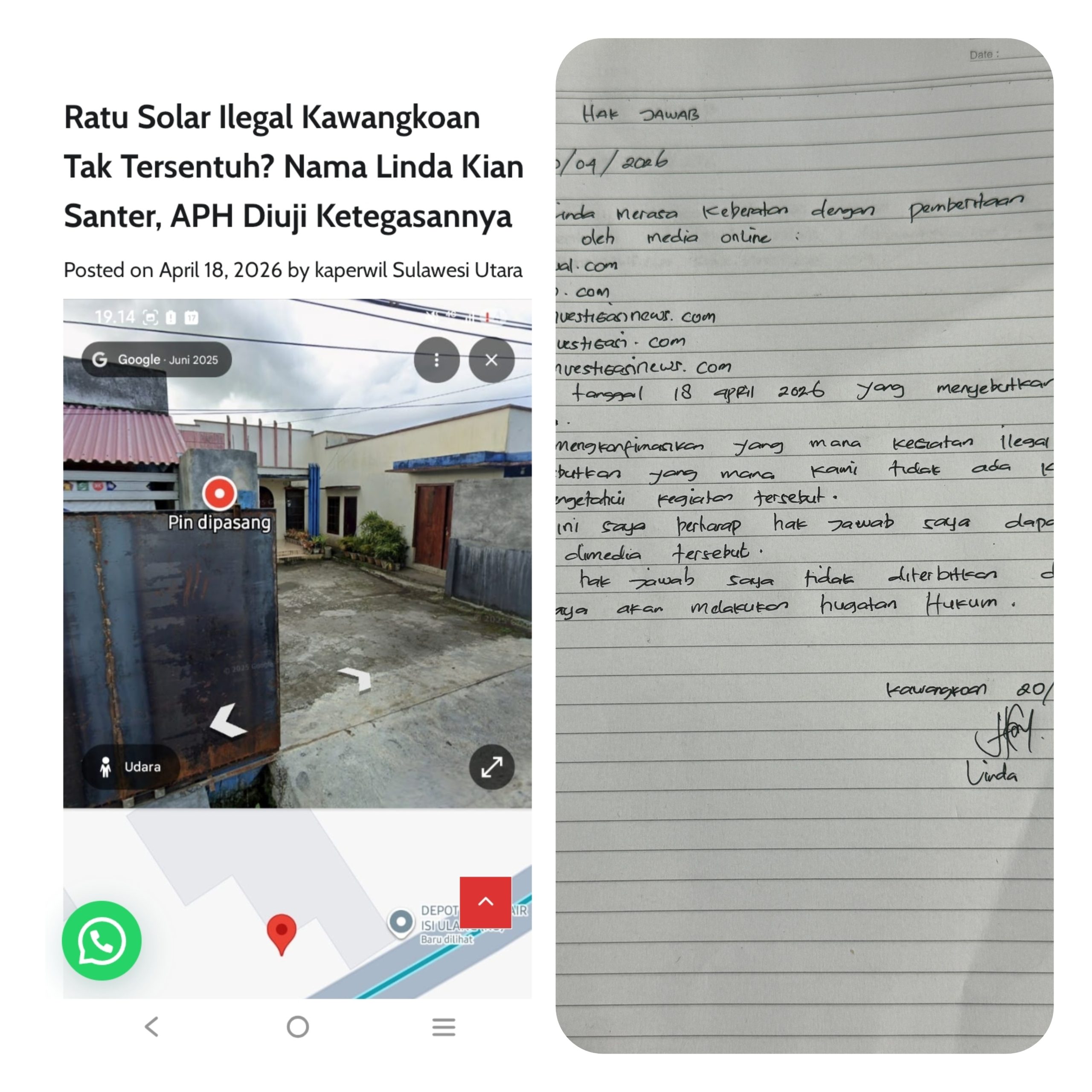 Minahasa – Ci Linda akhirnya angkat bicara terkait pemberitaan yang dimuat pada tanggal 18 April 2026 di sejumlah media online. Ia menegaskan bahwa informasi yang beredar tersebut tidak benar dan tidak sesuai dengan fakta yang sebenarnya.