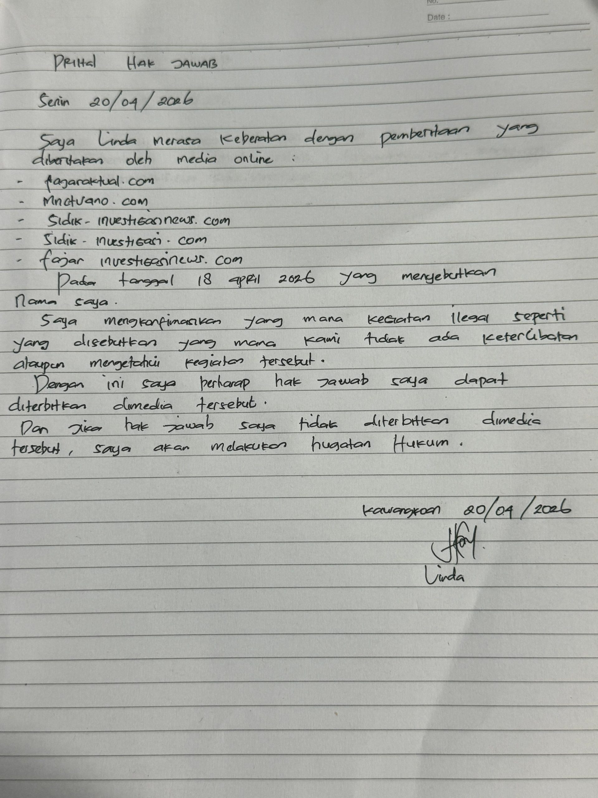Hak Jawab Ci Linda: Bantah Pemberitaan Tanggal 18 April 2026