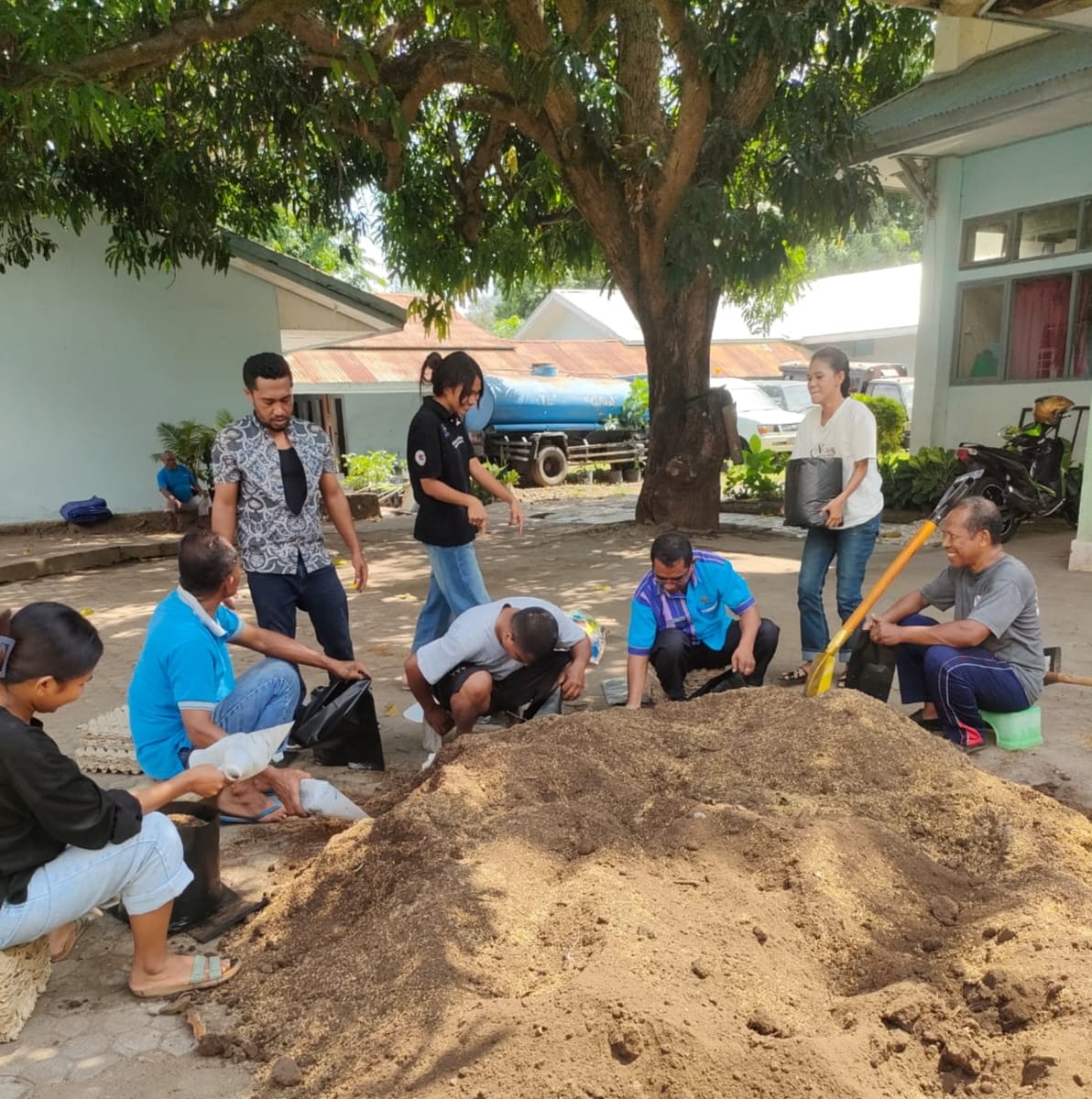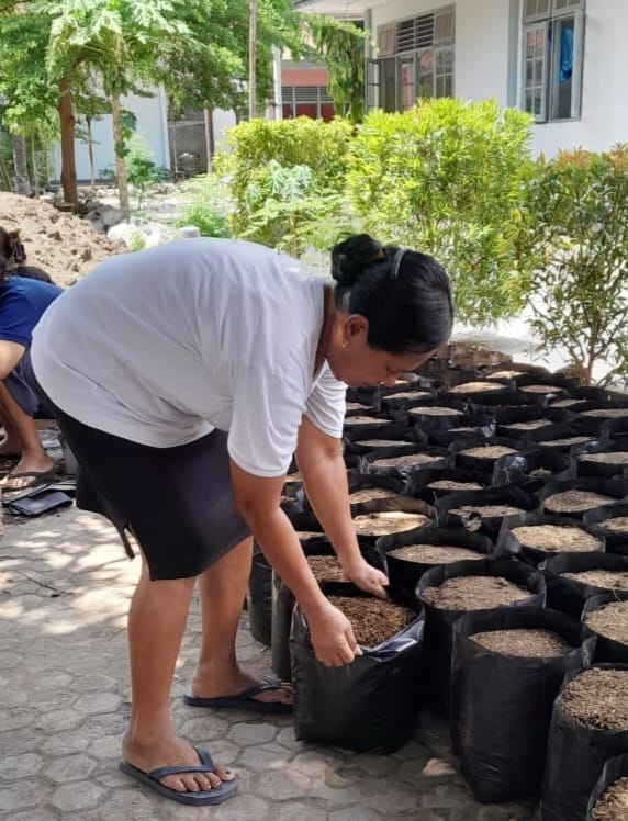Kiat menjadikan Panti Jompo Padu Wau Maumere hijau, indah, asri dan segar di pandang mata, Aparatur Sipil Negara bersama P3K dan mahasiswa psikologi Unipa yang magang di Panti mengadakan 255 polibag yang akan dibagikan kepada Lansia penghuni Wisma.