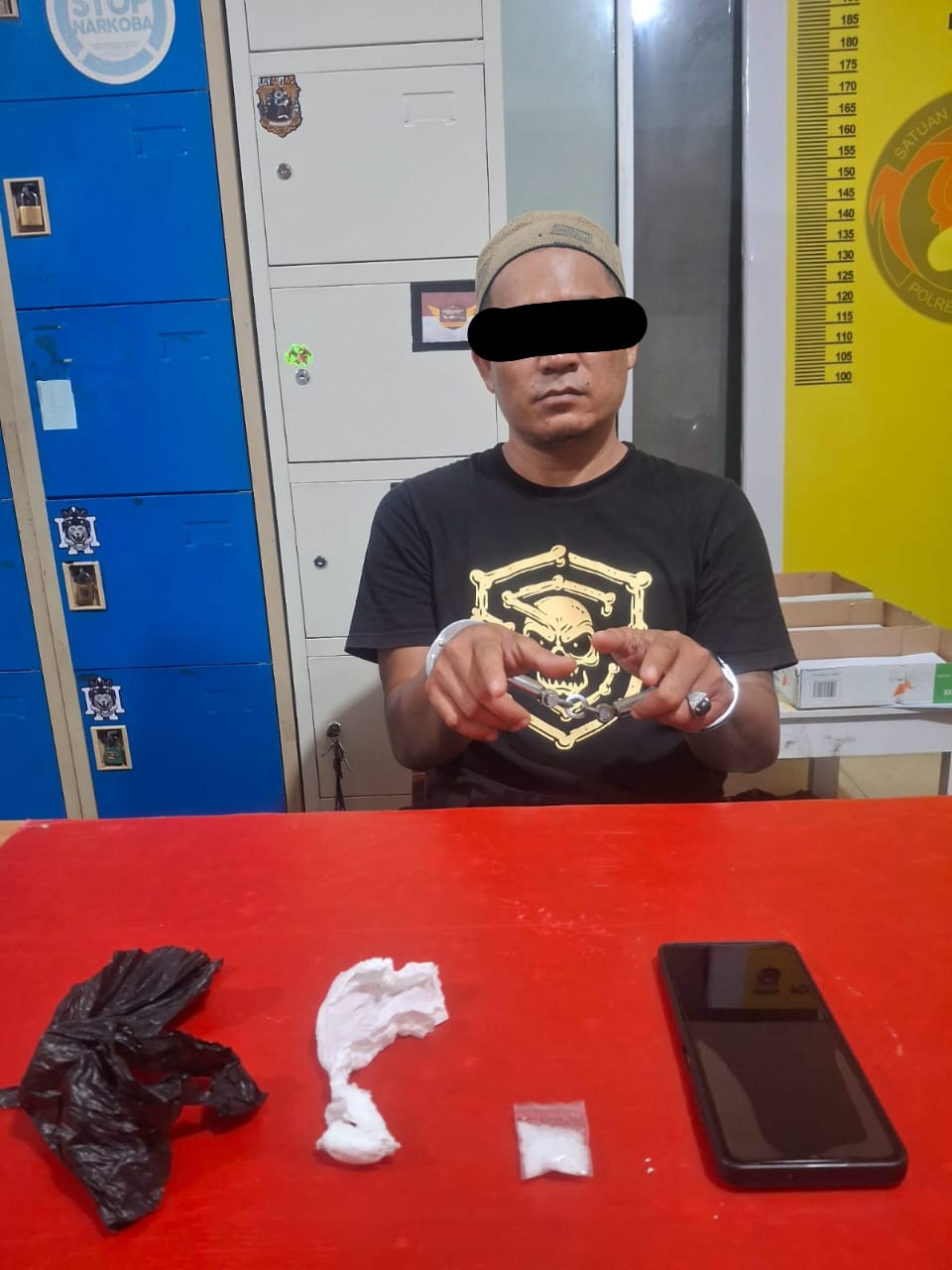 Tersangka MA alias A (39) kini diamankan di Polres Kuantan Singingi bersama barang bukti berupa satu paket sabu, plastik hitam, tisu pembungkus, dan handphone Samsung A06.