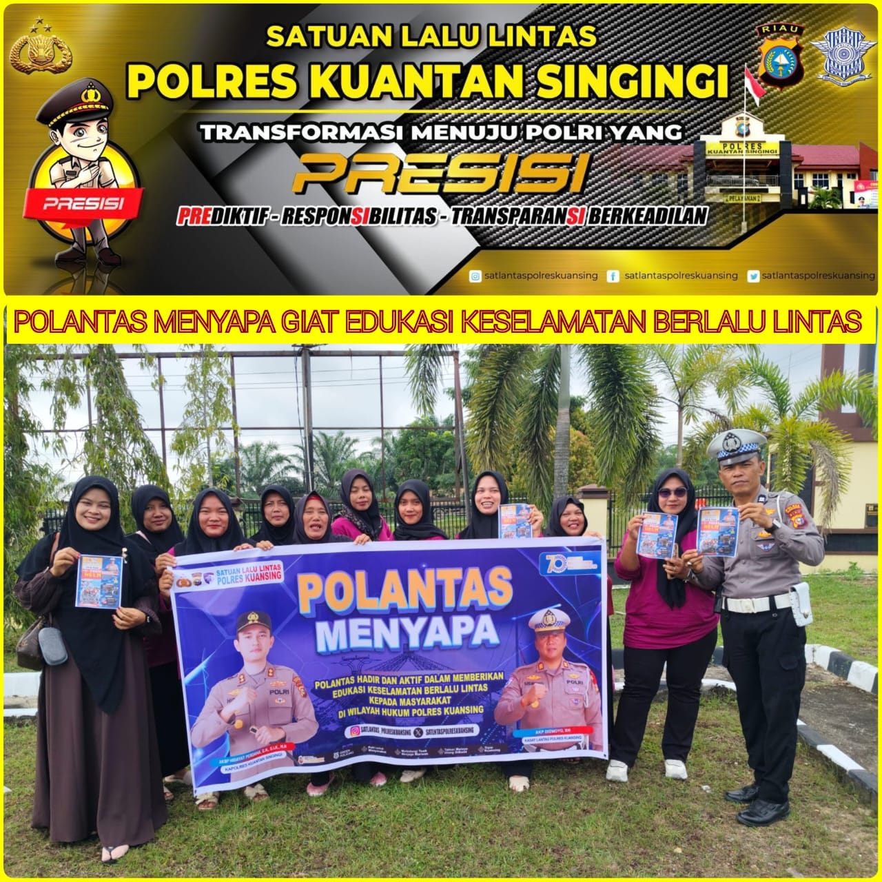 Kapolres Kuantan Singingi AKBP Hidayat Perdana, S.H., S.I.K., M.H. melalui Kasat Lantas Polres Kuantan Singingi AKP Siswoyo, S.H. menyampaikan bahwa kegiatan Polantas Menyapa merupakan bagian dari upaya preventif Polri dalam menekan angka kecelakaan lalu lintas di wilayah hukum Polres Kuantan Singingi.