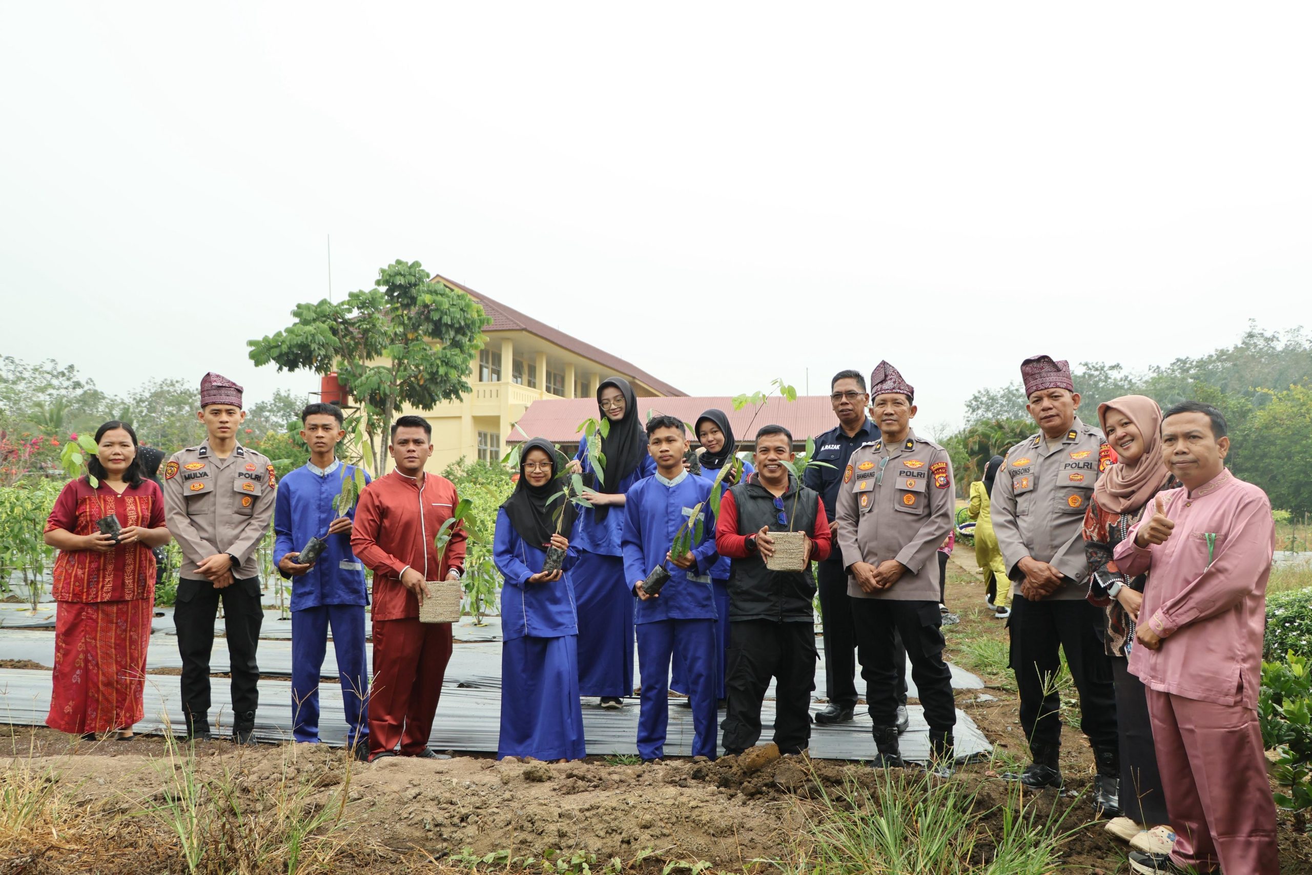 Kegiatan dilanjutkan dengan penanaman pohon secara simbolis oleh Kabag SDM Polres Kuansing bersama Kepala Sekolah SMKN 1 Sentajo Raya dan para siswa sebagai bentuk nyata kepedulian terhadap kelestarian lingkungan.