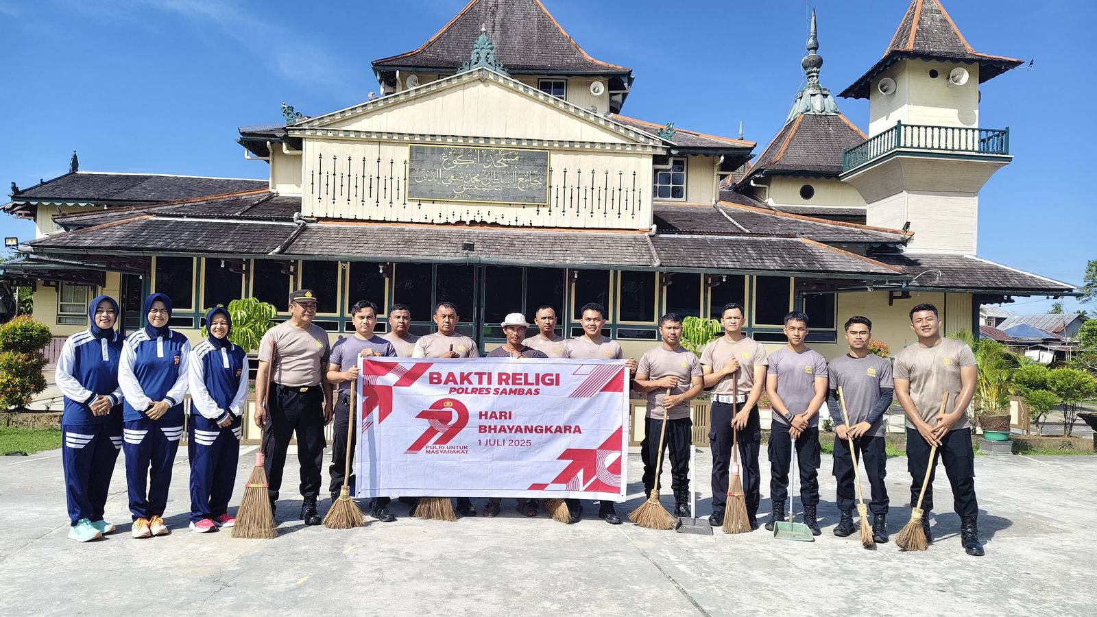 Sidik.investigasi.com Polres Sambas – Polda Kalbar, Dalam rangka memperingati Hari Bhayangkara ke-79 yang jatuh pada tanggal 1 Juli 2025, Polres Sambas melaksanakan kegiatan Bhakti Religi dan Bhayangkari Peduli pada Jumat, 20 Juni 2025. Kegiatan ini merupakan wujud nyata kepedulian Polri terhadap kebersihan dan kenyamanan tempat ibadah serta sebagai upaya mempererat hubungan Polri dengan masyarakat lintas agama di wilayah hukum Polres Sambas.