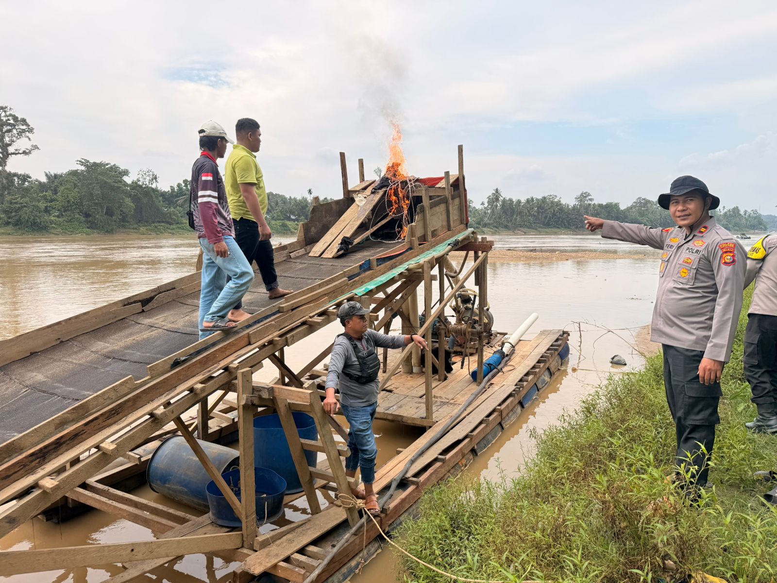 Untuk mencegah digunakan kembali oleh para pelaku, petugas langsung melakukan tindakan tegas dengan cara merusak dan membakar seluruh rakit serta peralatan yang ditemukan.