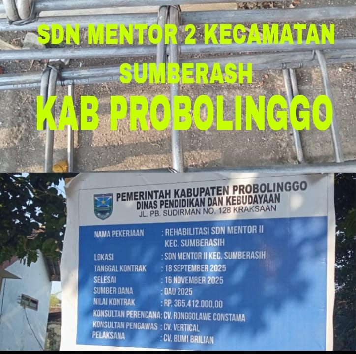 Berdasarkan hasil pantauan tim DPD LSM Penjara Indonesian bersama awak media di lokasi, ditemukan sejumlah indikasi ketidaksesuaian. Dari papan informasi proyek diketahui bahwa pekerjaan ini bersumber dari Dana Alokasi Umum (DAU) APBD Tahun Anggaran 2025 dengan nilai kontrak Rp365.412.000. Masa pelaksanaan ditetapkan 60 hari, mulai 18 September hingga 16 November 2025. Proyek tersebut dikerjakan oleh CV Bumi Berlian selaku pelaksana, CV Ronggolawe Constama sebagai konsultan perencana, dan CV Vertikal sebagai konsultan pengawas. Adapun instansi pemberi tugas adalah Dinas Pendidikan dan Kebudayaan Kabupaten Probolinggo.