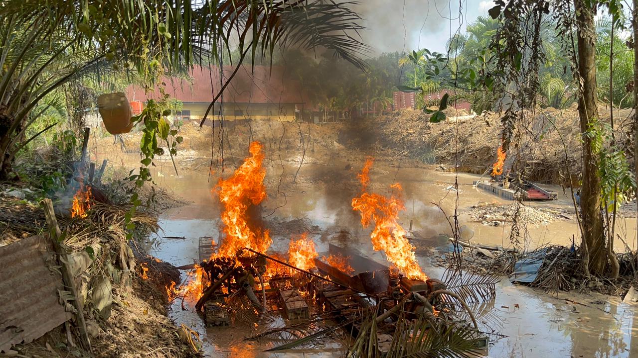Di TKP, petugas kemudian melakukan tindakan tegas dengan memusnahkan sebanyak lima unit rakit PETI jenis stingkai dengan cara dibakar.