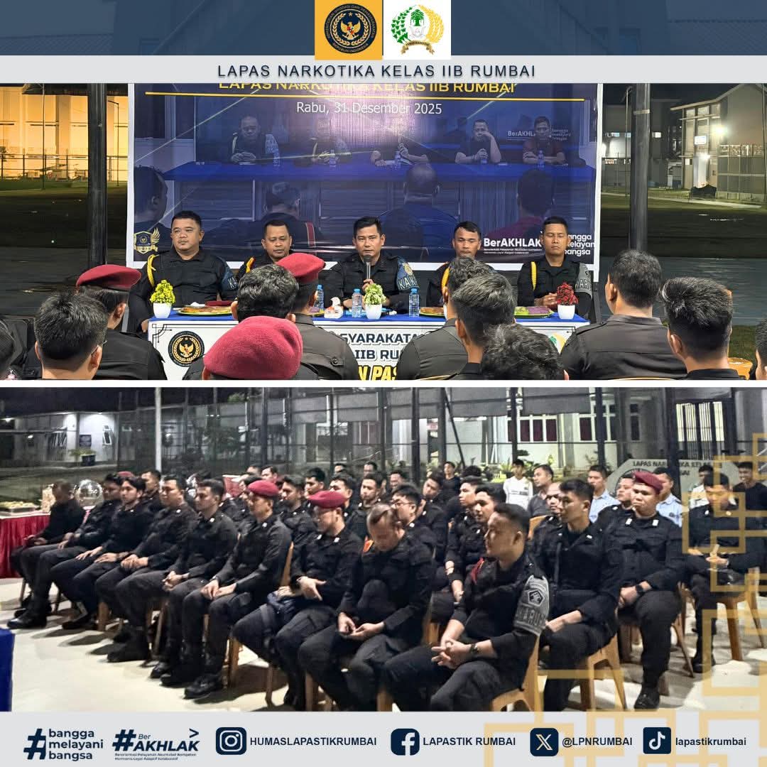“Malam ini saya mengapresiasi kinerja pengamanan pada Lapas Narkotika Rumbai selama tahun 2025, saya harap kita semua dapat mempertahankan kinerja serta meningkatkan deteksi dini, antisipasi gangguan kamtib dan berantas halinar”, ucap Ka.KPLP.