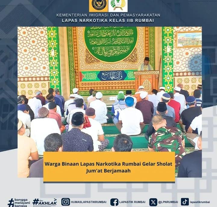 Sidik-investigasi.comPekanbaru – Warga Binaan Lembaga Pemasyarakatan Narkotika Kelas IIB Rumbai yang beragama Islam yaitu melakukan Sholat Jum’at berjamaah di Masjid At-taubah Lapas Narkotika Rumbai, Jum’at (12/09/2025).
